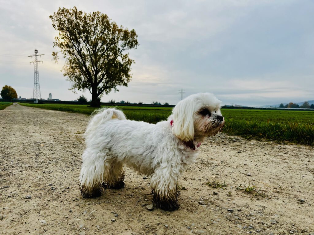 Ronja wohnte bei Kunden von mir. Das Ehepaar ist leider kurz hintereinander gestorben und wie es das Schicksal wollte, kam Ronja zu uns und lebt nun seit Ende 2024 bei uns. Sie empfängt die Kundenhunde immer neugierig und mit einigen spielt sie sogar, was dann immer sehr lustig ist. Von Fellpflege hält sie selbst nicht so viel. Sie liebt es im Dreck zu buddeln, was mit weißem Malteserhaar dann immer schmuddelig aussieht 🙂